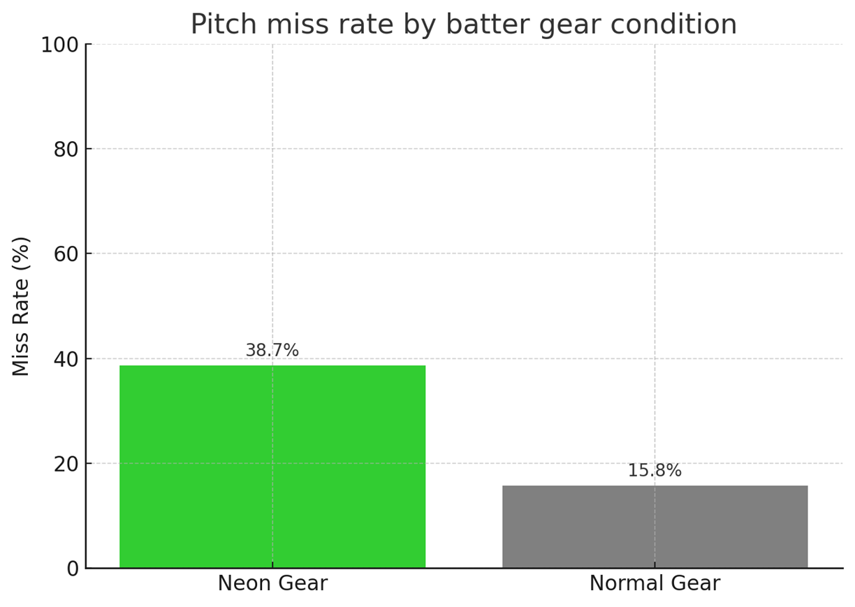 The chart underscores a subtle but important dynamic: neon gear may destabilize the pitcher’s control, but it also introduces uncertainty for the batter, who must adjust to unpredictable pitch trajectories. From an anthropological perspective, both players are operating within a shared perceptual environment shaped by visual signaling. Rather than a clear competitive advantage, the result is a form of mutual disruption—a shifting sensory landscape that alters timing, rhythm, and perception for both sides of the exchange.