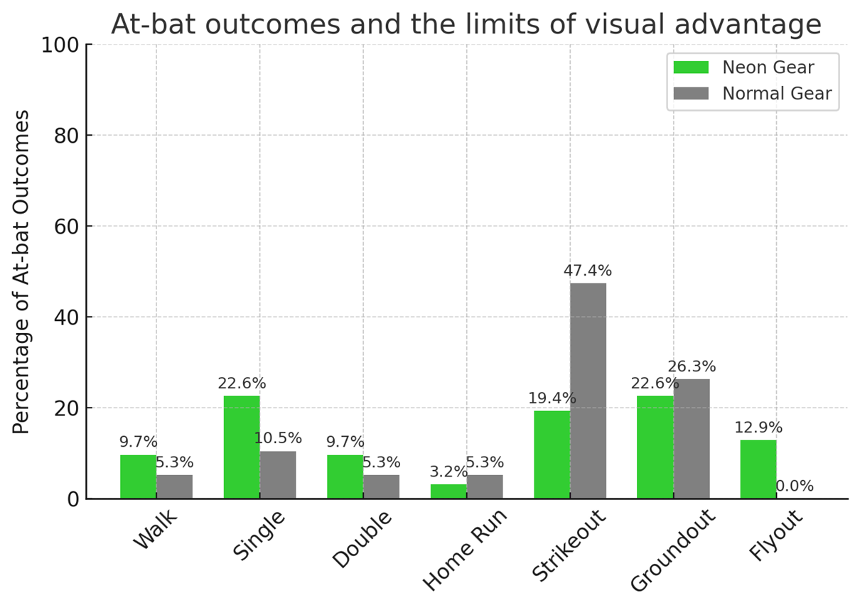This finding reinforces the study’s central claim: visual disruption does not guarantee competitive advantage. Instead, neon gear generates mutual instability—interfering with both the execution of the pitcher and the perception of the batter. What appears on the surface as expressive confidence may, in fact, fracture the internal rhythms required for clean, high-quality contact. In this sense, visual signaling becomes a double-edged disruption, creating an unstable perceptual field where symbolic assertion collides with embodied difficulty.